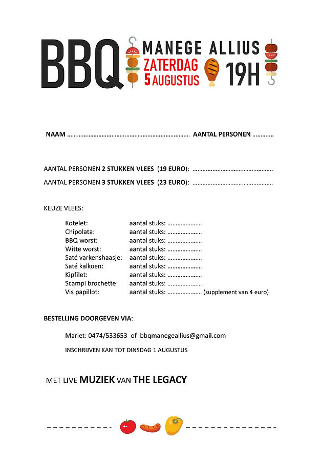 Je kan je bestelling telefonisch doorgeven aan Mariet of mailen naar bbqmanegeallius@gmail.com